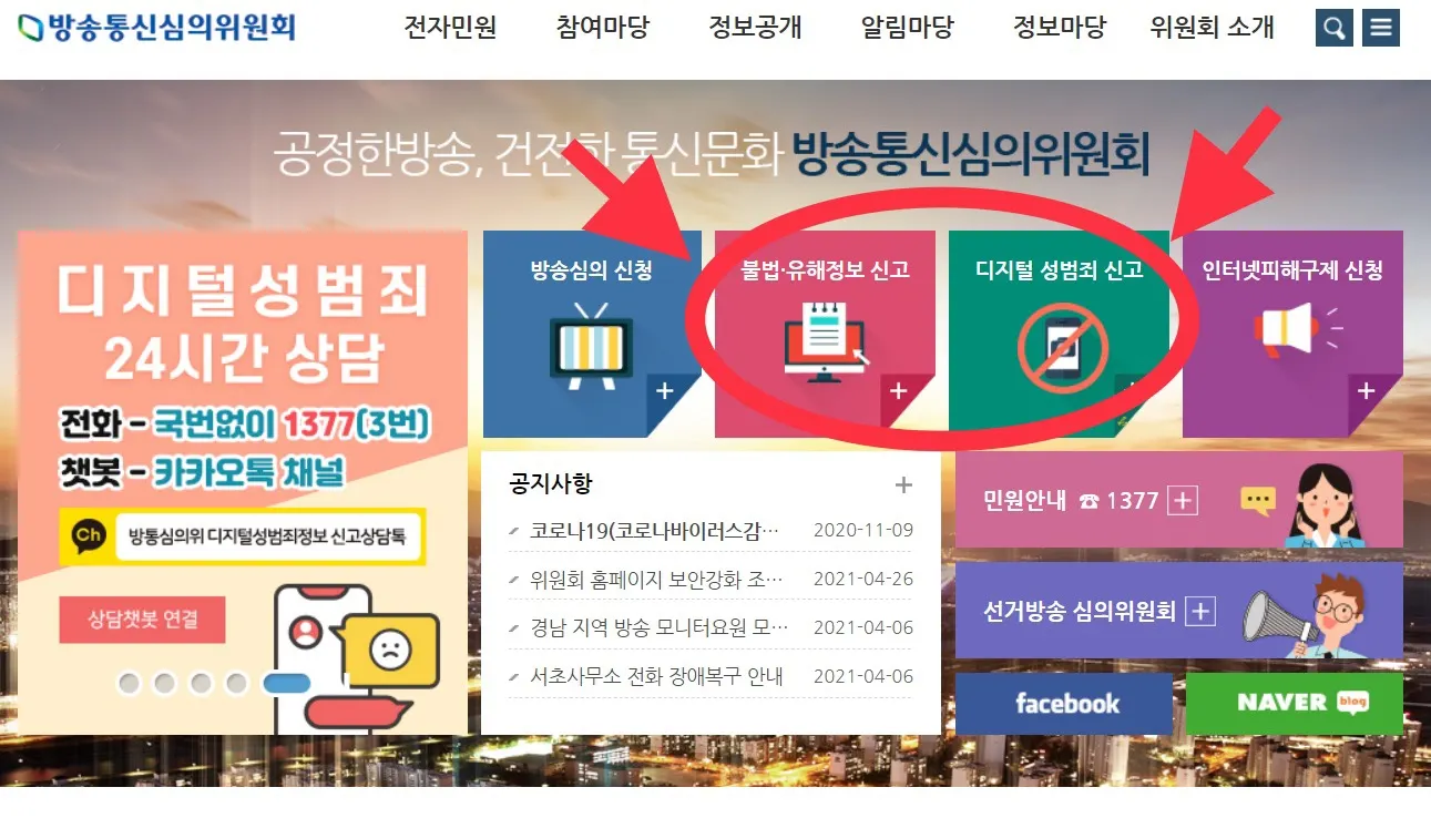 만약 디지털 성범죄 가해물이 올라오는 사이트를 발견했다면, 방송통신심의위원회(www.kocsc.or.kr)에서 불법/유해정보 신고 또는 디지털성범죄 신고를 통해 복제, 전송 중단, 사이트 차단 등의 조치가 가능합니다.