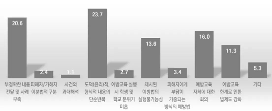(이미지 설명) 막대그래프. 부정확한 내용 전달 및 사례 부족 20.6%. 피해자와 가해자 이분법적 구분 2.4%. 사건의 과대해색 1.1%. 도덕적, 형식적 내용의 단순반복 23.7%. 예방교육 실행 시 학생 및 학교 분위기 미흡 2.7%. 제시된 예방법의 실행 불가능성 13.6%. 피해자에게 부담이 가중되는 방식의 예방법 3.4%. 예방교육 자체에 대한 회의 16.0%. 예방교육 한계로 인한 법제도 강화 11.3%. 기타 5.3%.